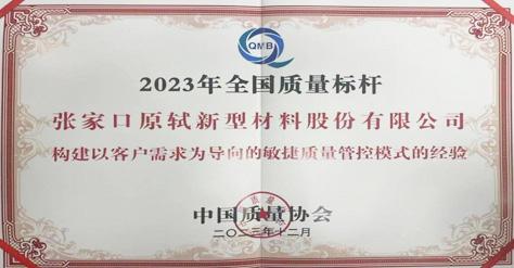 2023-12-072023年12月,張家口原軾新型材料股份有限公司憑借 “構建以客戶需求為導向的敏捷質量管控模式的經(jīng)驗”,榮獲2023年全國質量標桿企業(yè)。